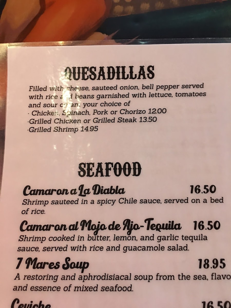 Grilled skirt steak or chicken, shrimp, and onions, marinated in chipotle sauce, served with rice, beans, and tortillas.